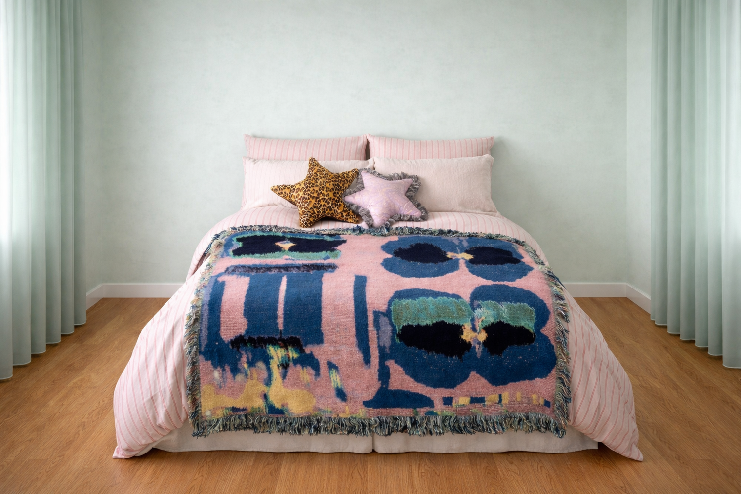 The design language centers on curved forms, warm textures, and a subtle conversation between classic and natural elements. The artwork above the bed became the anchor - its organic lines dancing across a palette of terracotta, soft beige, and blush tones layered through the bedding and rug.